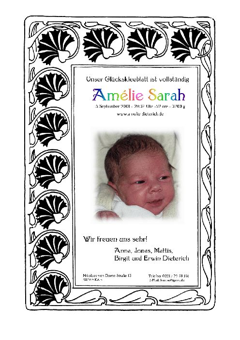 Hier kann man die Geburtsanzeige von Amélie verkleinert anschauen.